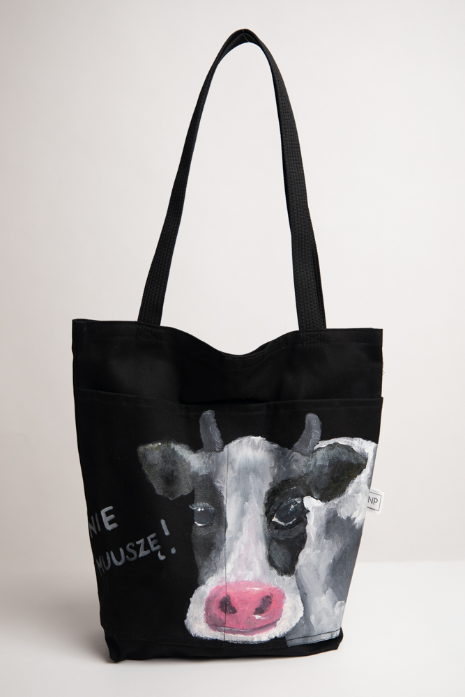 Ręcznie malowana torba na zakupy – KRÓWKA została uszyta z grubej bawełny – drelichu o splocie skośnym, przy użyciu maszyny wieloczynnościowej. Środek wykończony szwem francuskim. Malunek został wykonany farbami akrylowymi do tkanin. Ze względu na użycie w 100% naturalnego materiału, torba po pierwszym praniu się skurczy o 5-10%. To normalne zjawisko. Malunek natomiast się nie spiera, farby są trwałe.