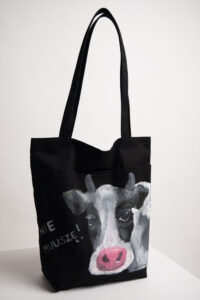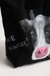 Ręcznie malowana torba na zakupy – KRÓWKA została uszyta z grubej bawełny – drelichu o splocie skośnym, przy użyciu maszyny wieloczynnościowej. Środek wykończony szwem francuskim. Malunek został wykonany farbami akrylowymi do tkanin. Ze względu na użycie w 100% naturalnego materiału, torba po pierwszym praniu się skurczy o 5-10%. To normalne zjawisko. Malunek natomiast się nie spiera, farby są trwałe.
